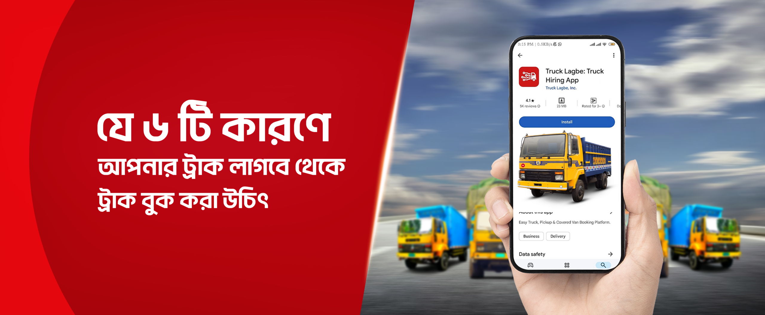 আগে যেখানে ট্রাক বুক করতে হলে একাধিক জায়গায় খোঁজ নিতে হতো, এখন ট্রাক লাগবে অ্যাপ দিয়ে মাত্র কয়েক ক্লিকেই ট্রাক বুক করা যায়। অ্যাপে গন্তব্য ও মালামালের ধরন নির্বাচন করলেই আপনার জন্য উপযুক্ত ট্রাক পেয়ে যাবেন মুহূর্তেই।